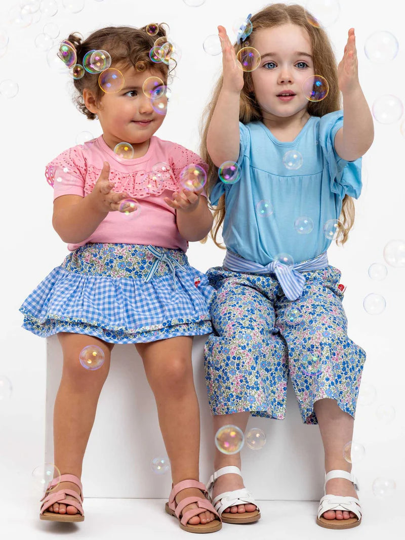 Our pants are pretty and sweet, made from hand-printed fabric and featuring a contrast belt, but are just so comfy you'll be reaching for them day after day.